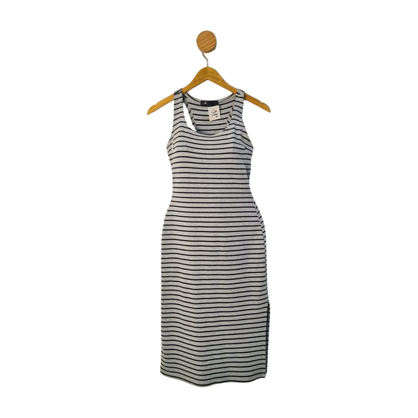 Vestido listrado em malha canelado, fenda na lateral, decote nadador nas costas, 67% Algodão, 29% Poliéster, 4% Elastano. Medidas: 82 cm busto, 76 cm cintura, 94 cm quadril, 106 cm comprimento.