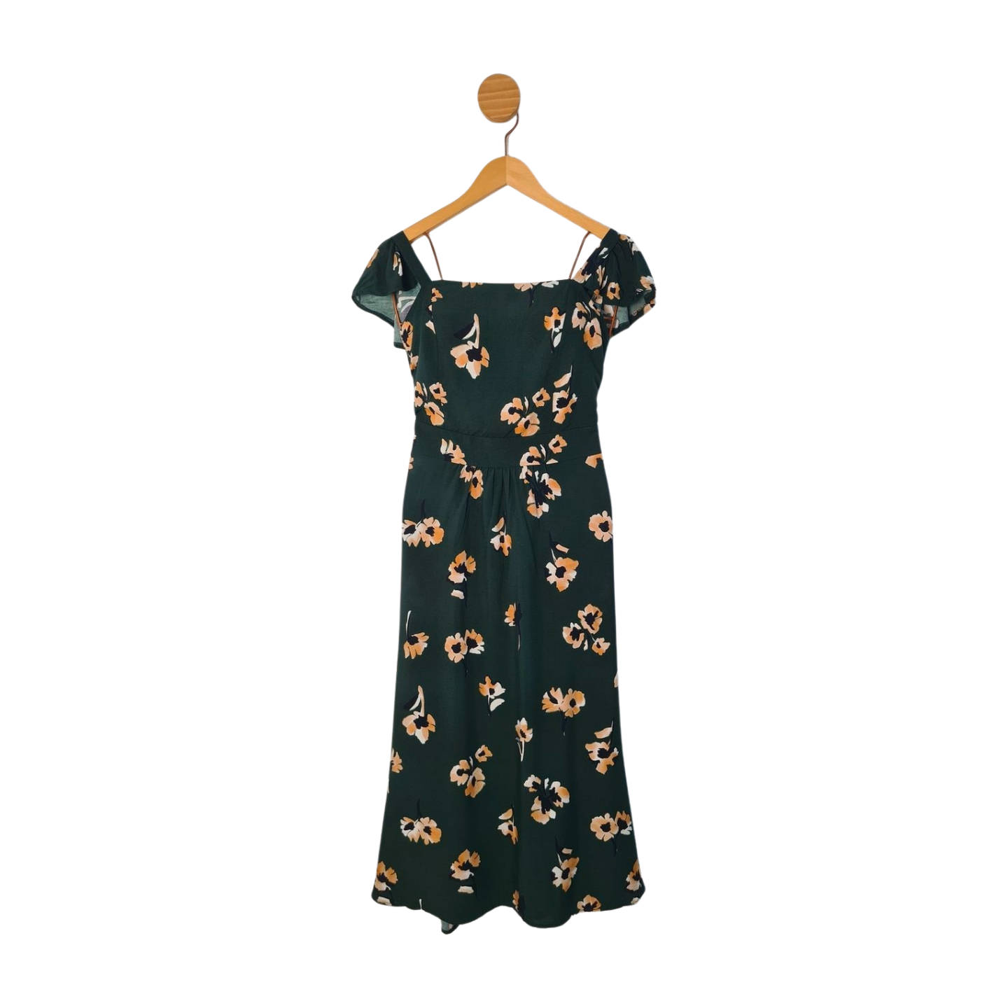 Vestido longo verde, com ziper lateral e estampa florida, 100%Viscose. Medidas: 90 cm busto, 84 cm cintura, 130 cm quadril, 122 cm comprimento.
