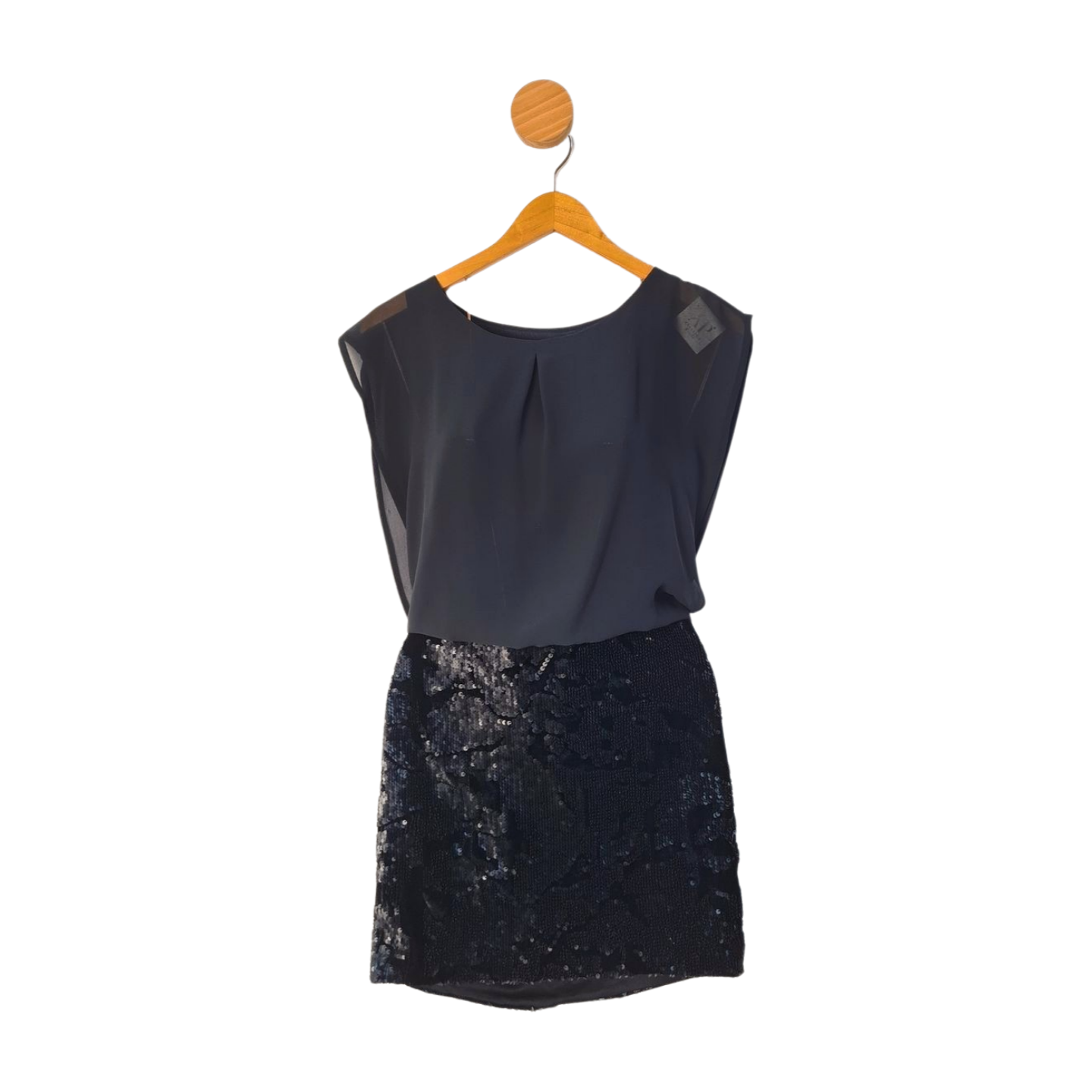 Vestido com parte superior soltinha em duas camadas de crepe e mais ajustado na parte do quadril, em malha encorpada e forrada com aplicação de paetês e veludo. Medidas: 96 cm busto, 82 cm cintura, 98 cm quadril, 86 cm comprimento.