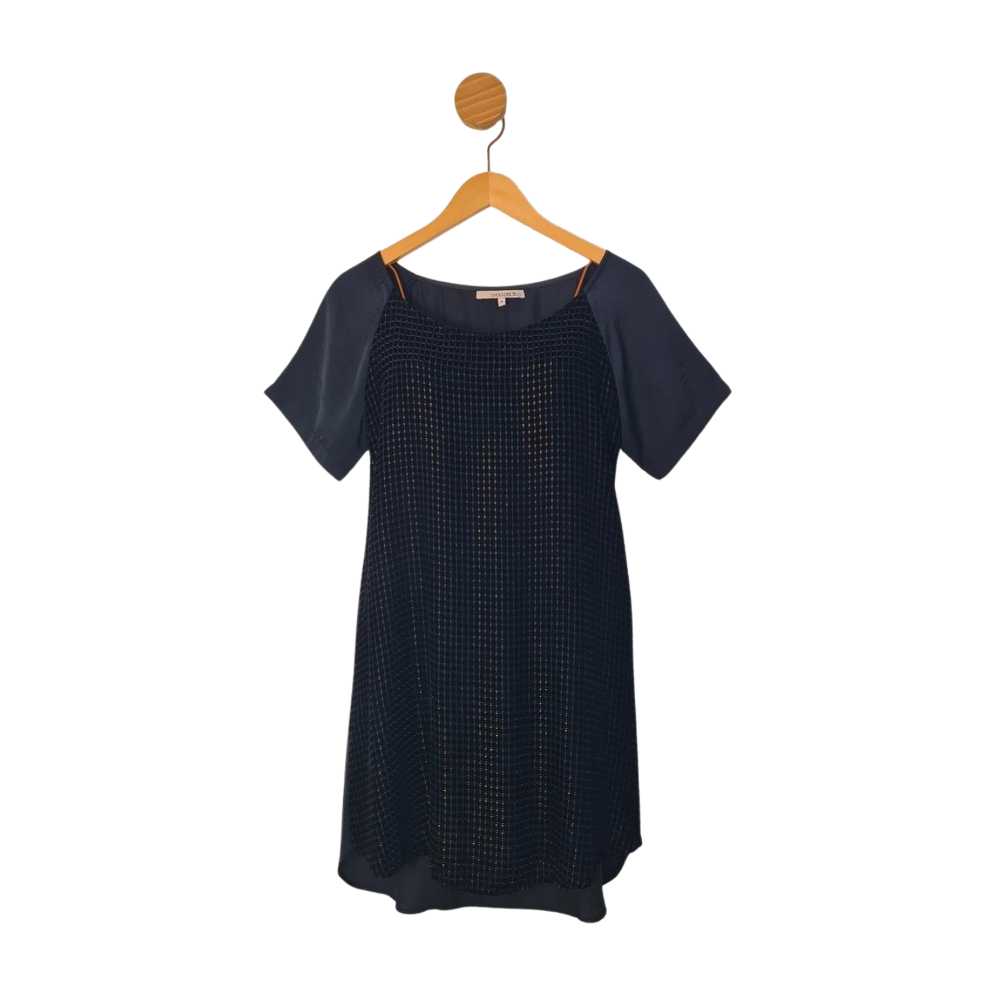 Vestido casual com forro com frente em veludo textura quadriculada e fios douradas. Medidas: 100 cm busto, 104 cm cintura, 110 cm quadril, 82/91 cm comprimento.