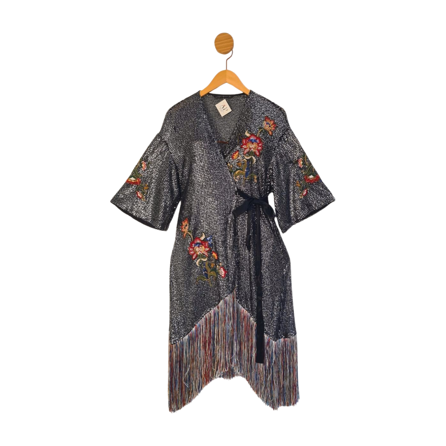Vestido paetê envelope franjas, bordado de flores no busto e nas mangas. Medidas: 90 cm busto, 82 cm cintura, 130 cm quadril, 110 cm comprimento.