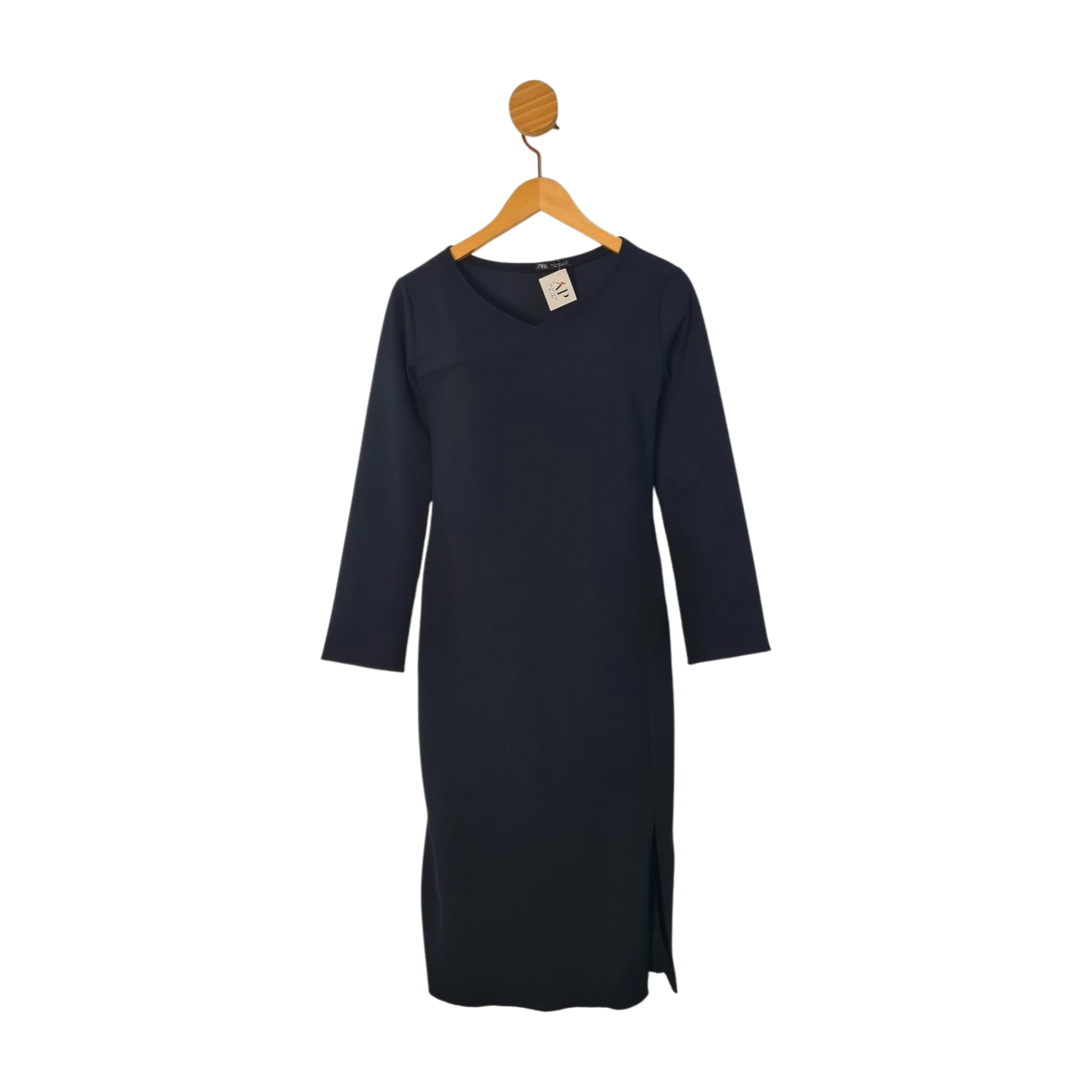 Vestido longo e com manga longa, decote V, fenda na lateral, em crepe encorpado com elasticidade. Medidas: 90 cm busto, 88 cm cintura, 106 cm quadril, 110 cm comprimento.
